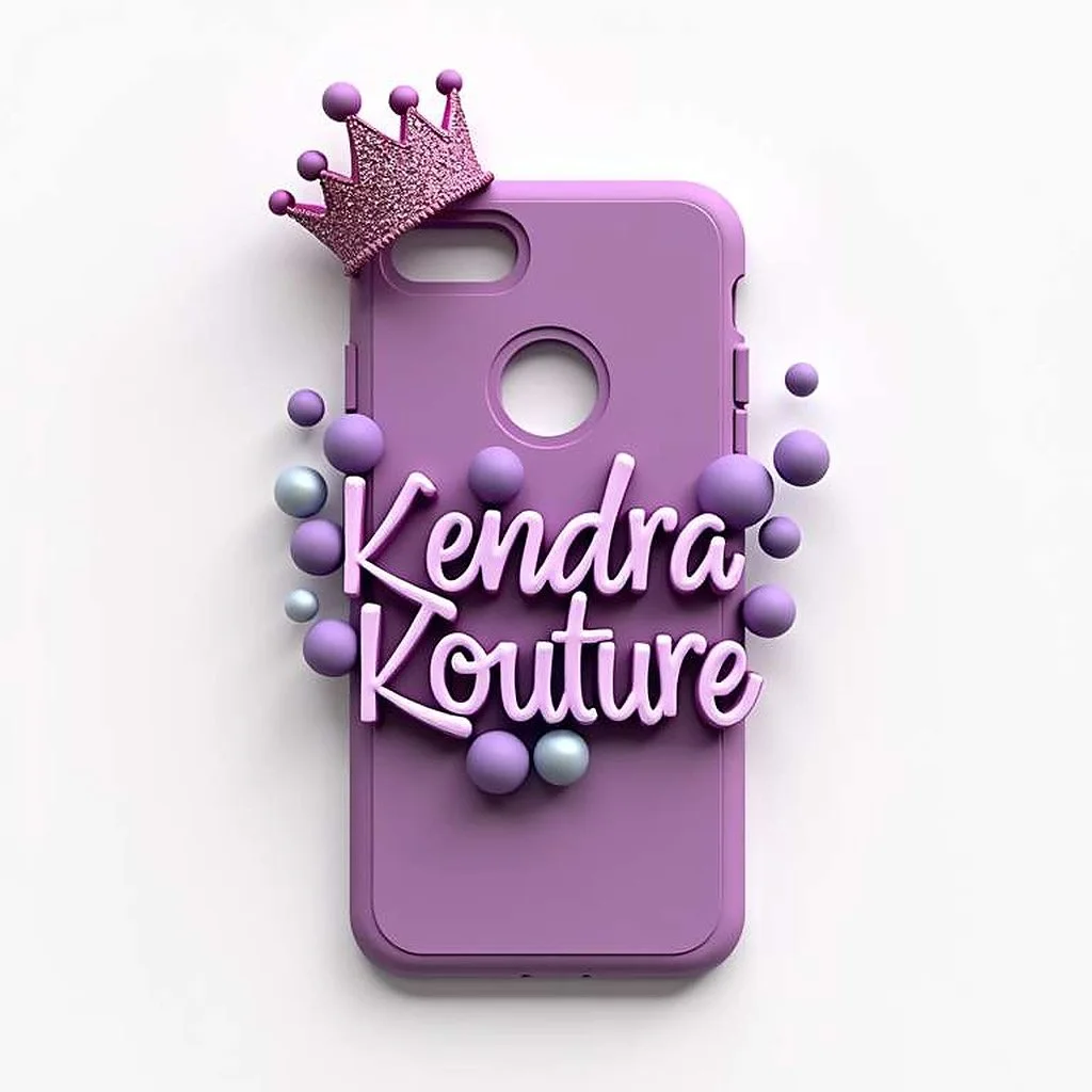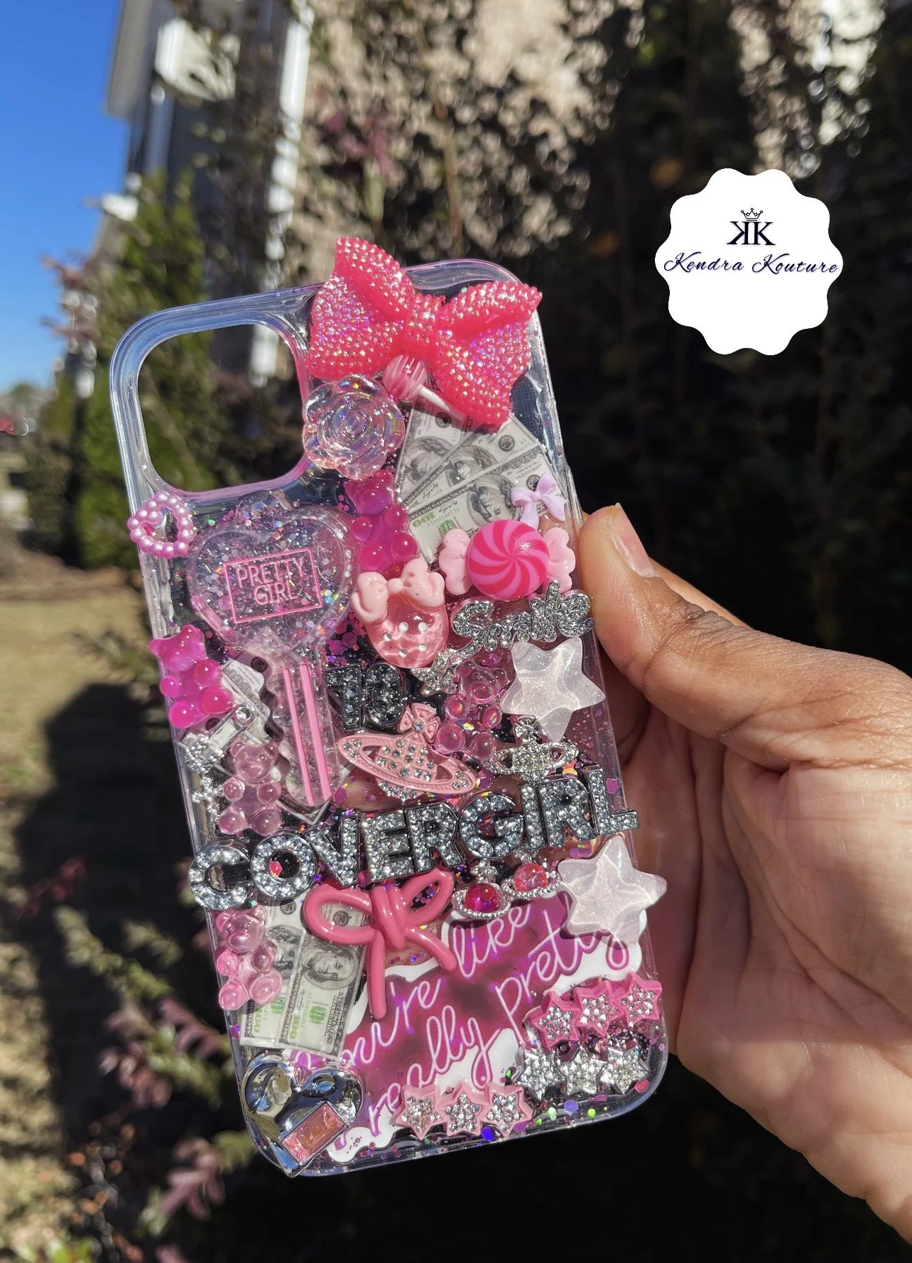 Hand holding a phone case decorated with pink and silver charms, beads, and stickers, including bows, stars, and the words 'Pretty Girl' and 'Confersgirl' amidst dollar bills, with a blurred outdoor background.