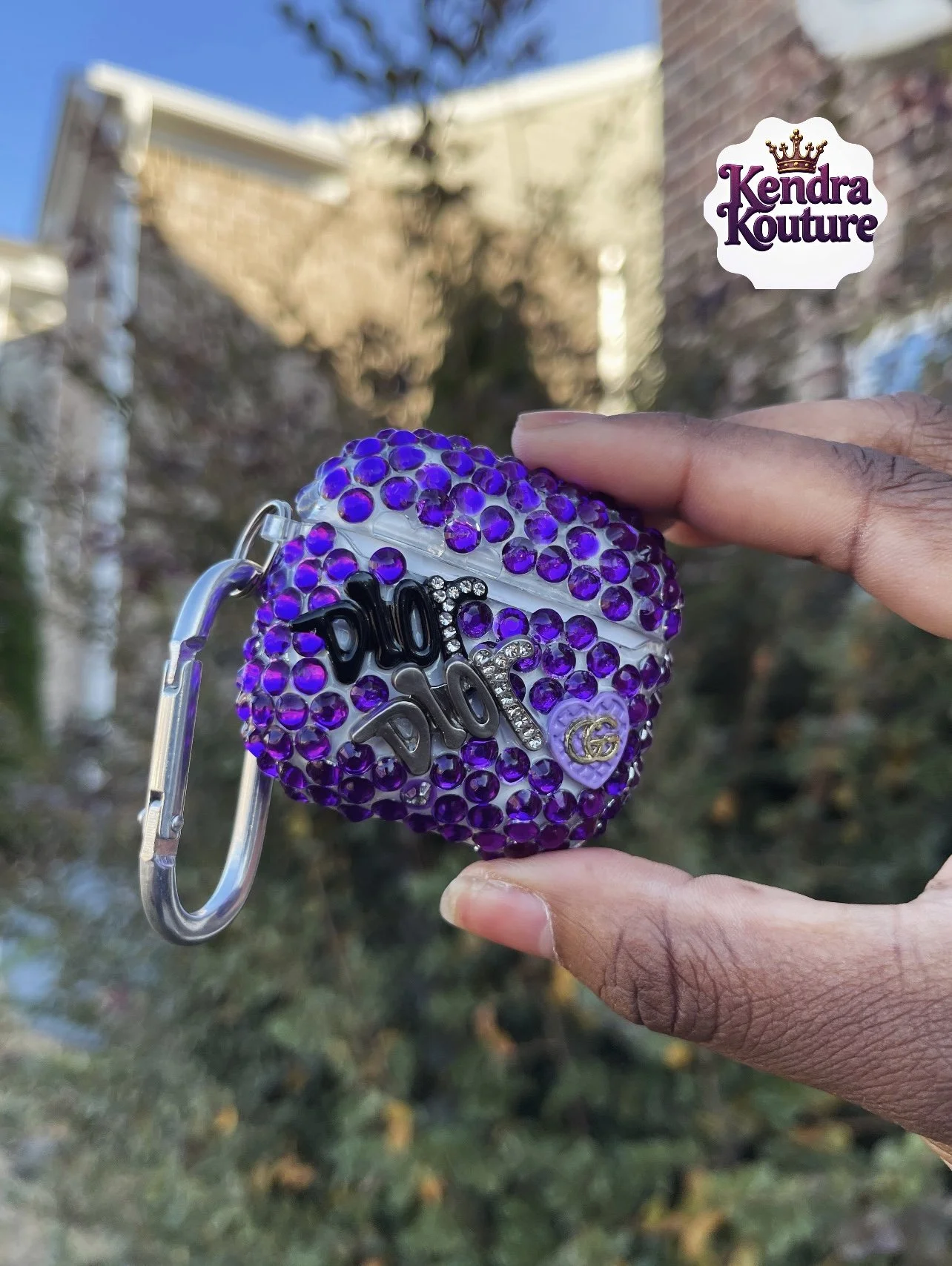 A hand holding a purple rhinestone-covered AirPods case with decorative letters and symbols on it, outdoors with a house and trees in the background.
