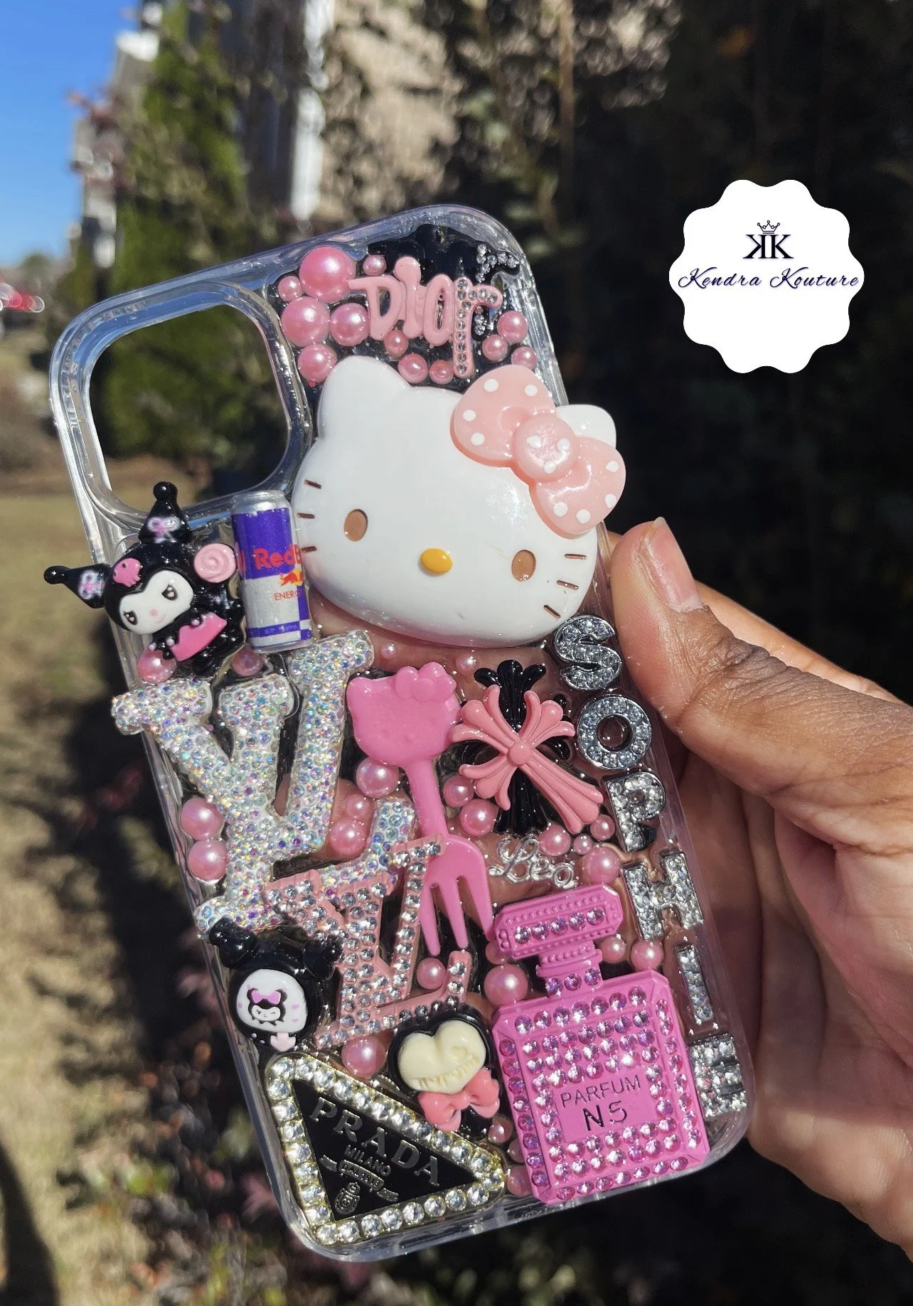 A decorated phone case featuring Hello Kitty, pink pearls, rhinestones, and various charms including a Prada logo, perfume bottle, and other figures in pink and black.