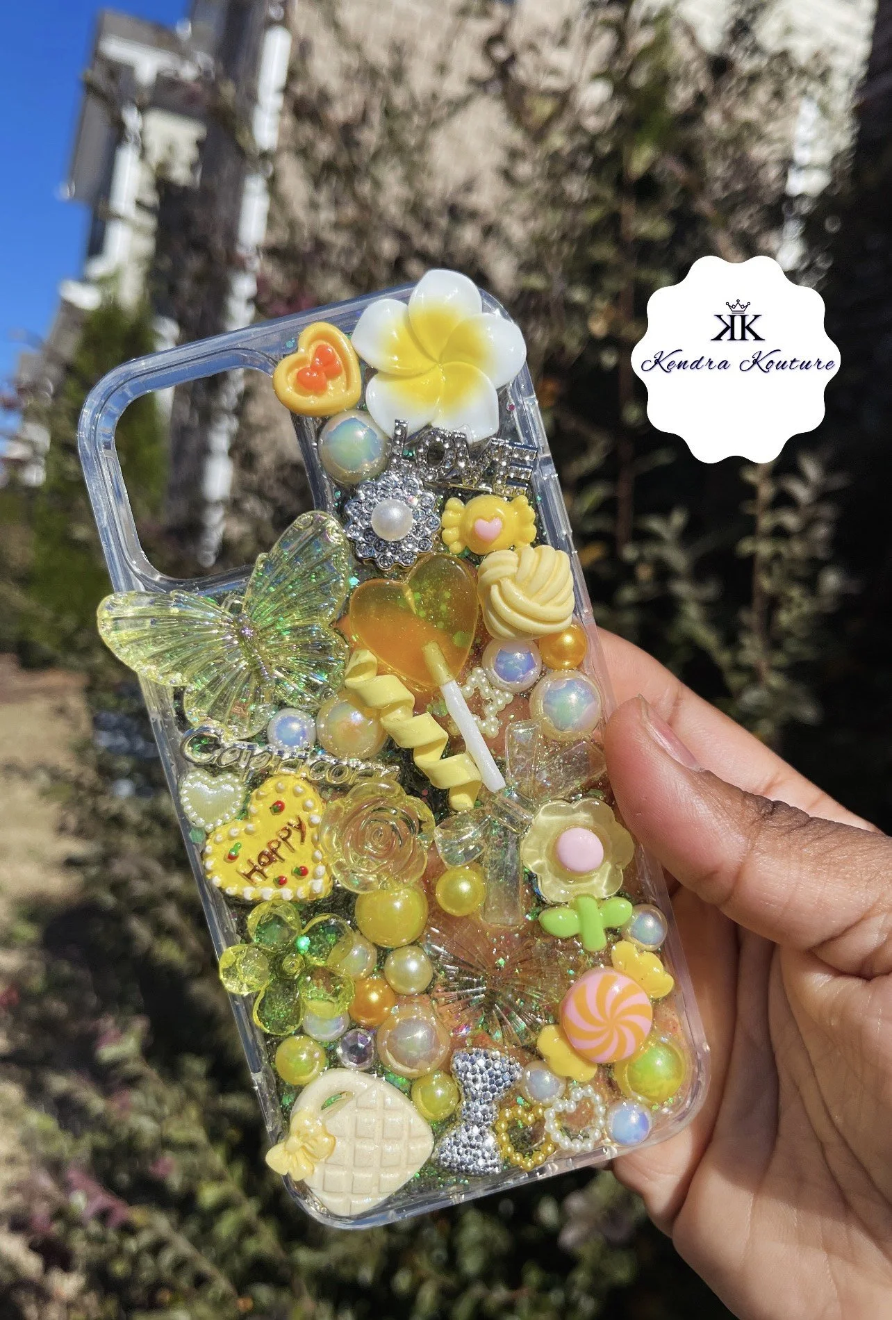 Hand holding a phone case decorated with colorful charms, including a butterfly, flowers, hearts, pearls, and a lollipop, outdoors with trees and a building in the background.